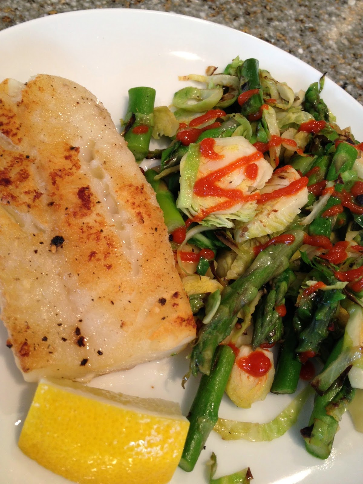 | blackened shrimp, roasted sweet potato wedges, and brussels sprouts sauteed with shallots |